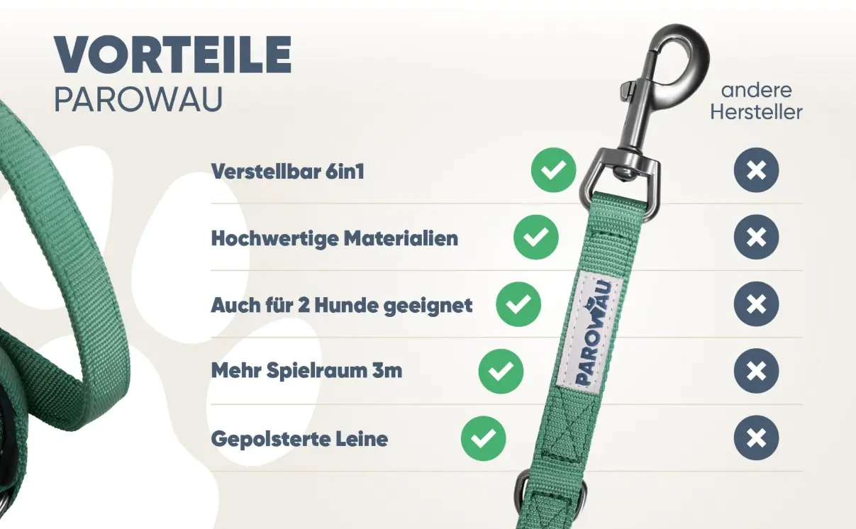Ob entspannter Spaziergang im Park, aktives Training oder zwei Hunde gleichzeitig an der Leine – mit unseren verstellbaren Hundeleinen von PAROWAU bist du für jede Situation gerüstet.