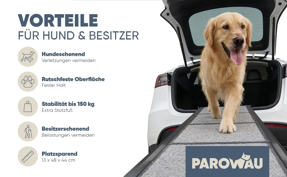 Ob beim Ein- und Aussteigen ins Auto, auf Reisen oder zuhause – mit der Hunderampe von PAROWAU ermöglichst du deinem Vierbeiner einen sicheren und gelenkschonenden Aufstieg in jeder Situation.